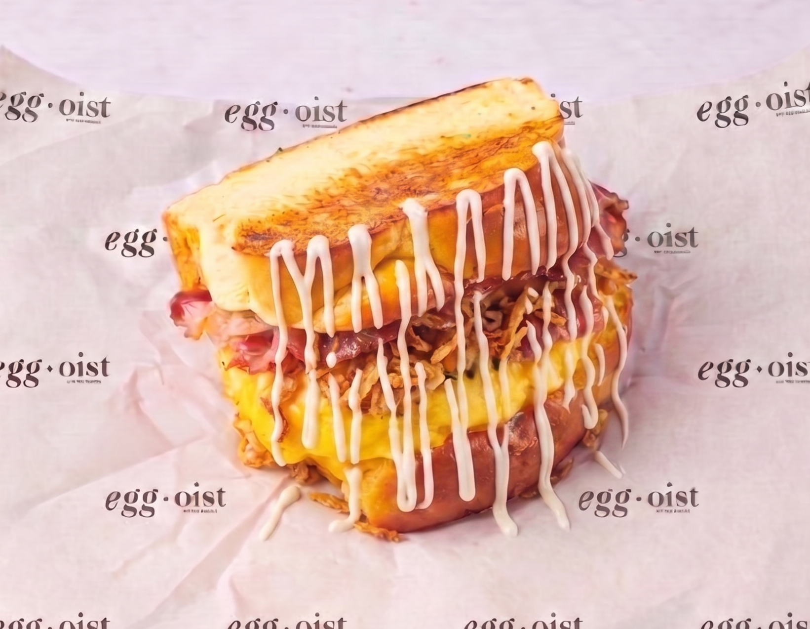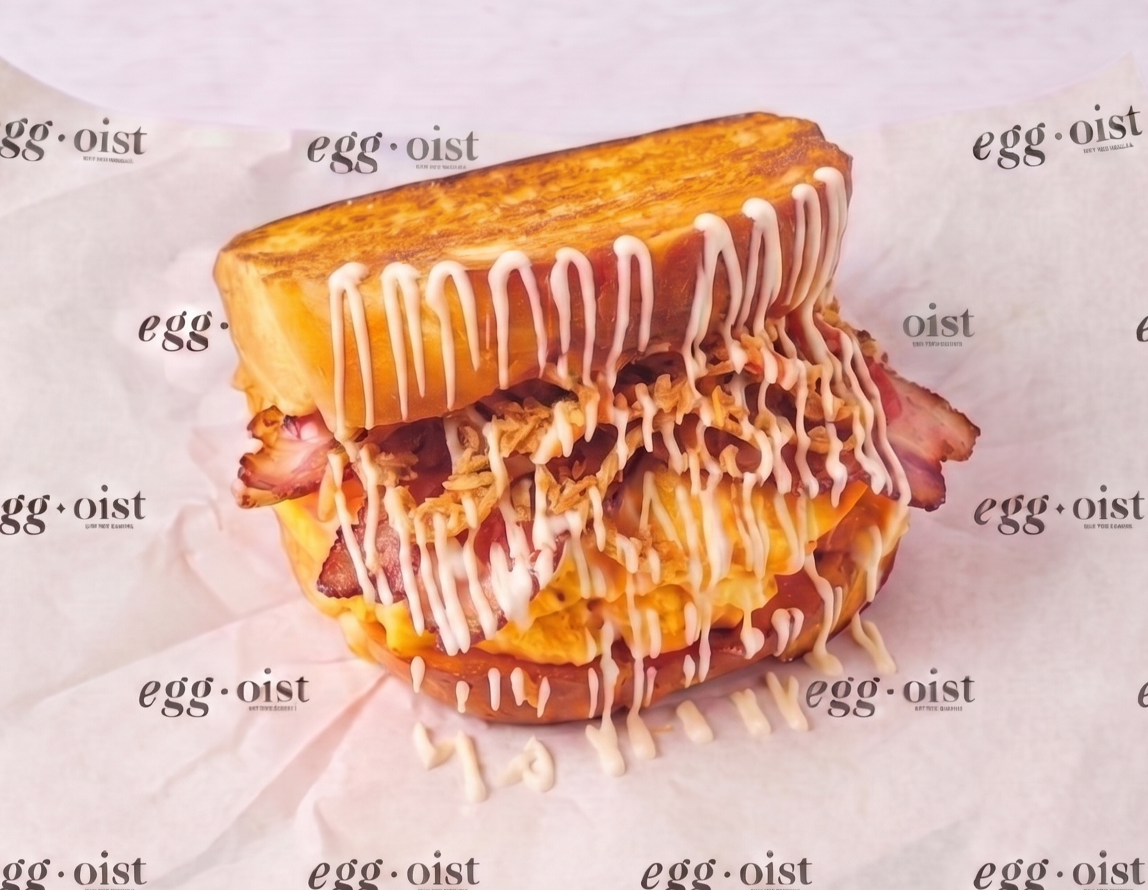 — scrambled eggs, cheddar, pork bacon, crispy onions, spicy mayo.